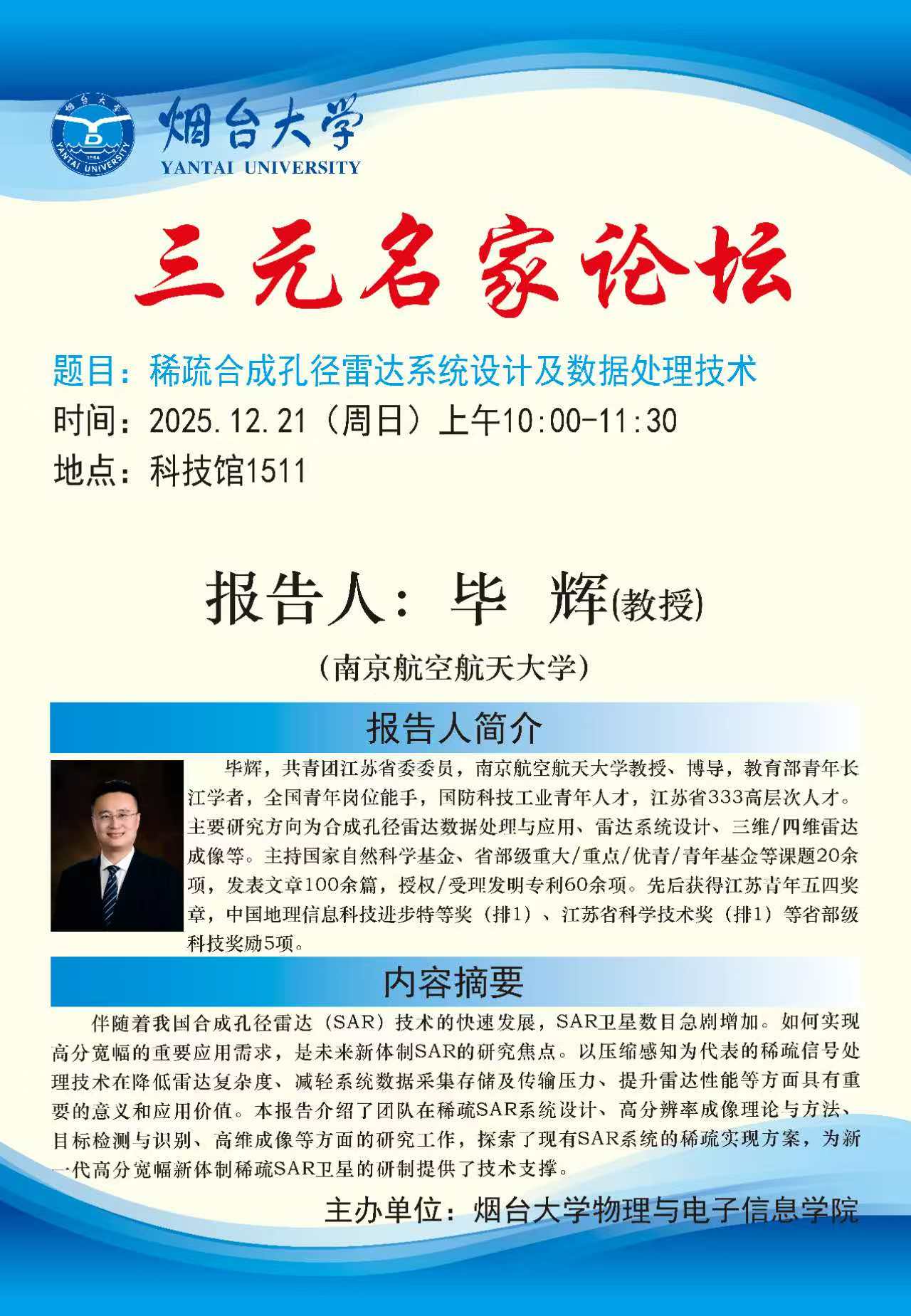 主讲人介绍:毕辉,共青团江苏省委委员,南京航空航天大学教授、博导,教育部青年长江学者,全国青年岗位能手,国防科技工业青年人才,江苏省333高层次人才。主要研究方向为合成孔径雷达数据处理与应用、雷达系统设计、三维/四维雷达成像等。主持国家自然科学基金、省部级重大/重点/优青/青年基金等课题20余项,发表文章100余篇,授权/受理发明专利60余项。先后获得江苏青年五四奖章,中国地理信息科技进步特等奖(排1)、江苏省科学技术奖(排1)等省部级科技奖励5项。